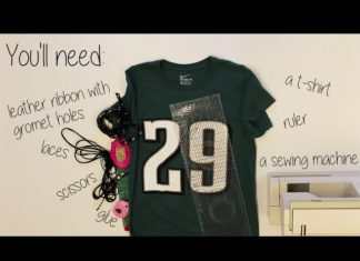 Add some flair to an old sports jersey or t-shirt in 9 easy steps and look good with trendy shoulder cutouts and sporty lacing. Follow our simple tutorial and cheer on your team with a little extra style this game day!
